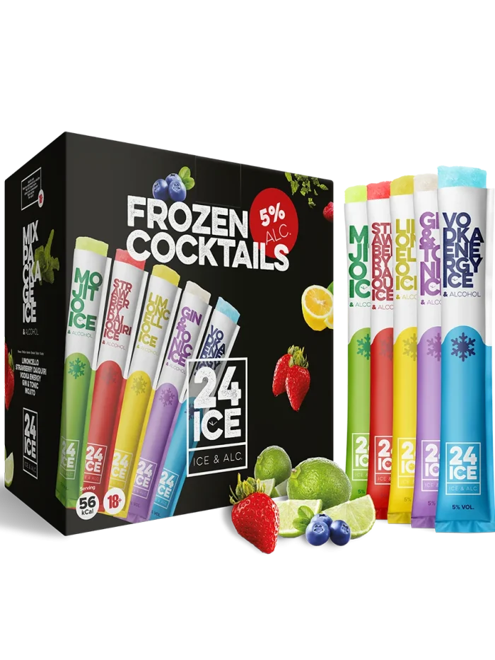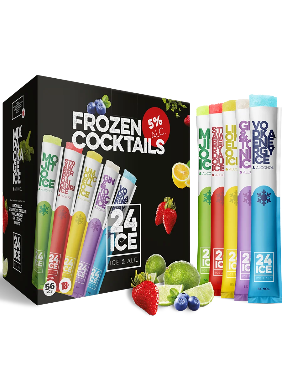 24 ICE Frozen Cocktails Mix Package este un pachet inovator de cocktailuri congelate sub formă de „poptails” (înghețată alcoolică), ideal pentru a adăuga un strop de culoare și prospețime oricărei petreceri sau zile călduroase de vară. Acest produs combină gustul clasic al cocktailurilor cu o prezentare modernă și distractivă.